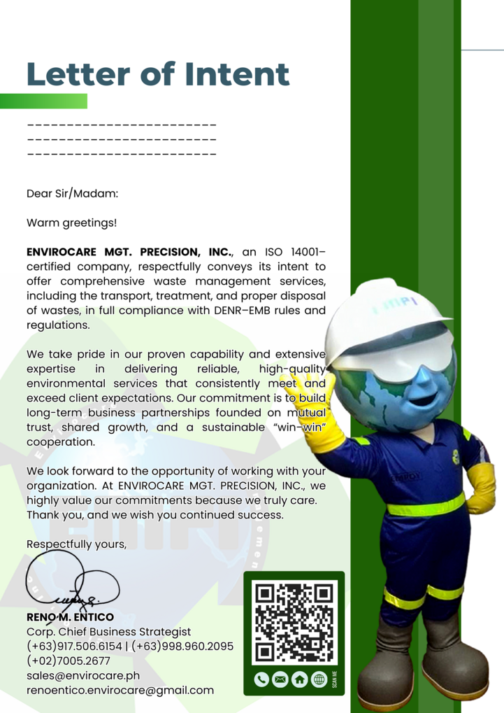 Envirocare Mgt. Precision, Inc., is a private organization of responsible professionals specialized in the field of waste transport, proper treatment and disposal of both hazardous & non hazardous wastes. It is registered with the Securities and Exchange Commission on February 16, 2007 as a corporation and consequently recognized as one of the wastes transporters / treater by the Department of Natural Resources under Environmental Management Bureau (DENR-EMB) and Philippine Economic Zone Authority (PEZA) with Transporter Registration No. OL-TP-R3-14-000143 and RWH-2022-134 respectively.